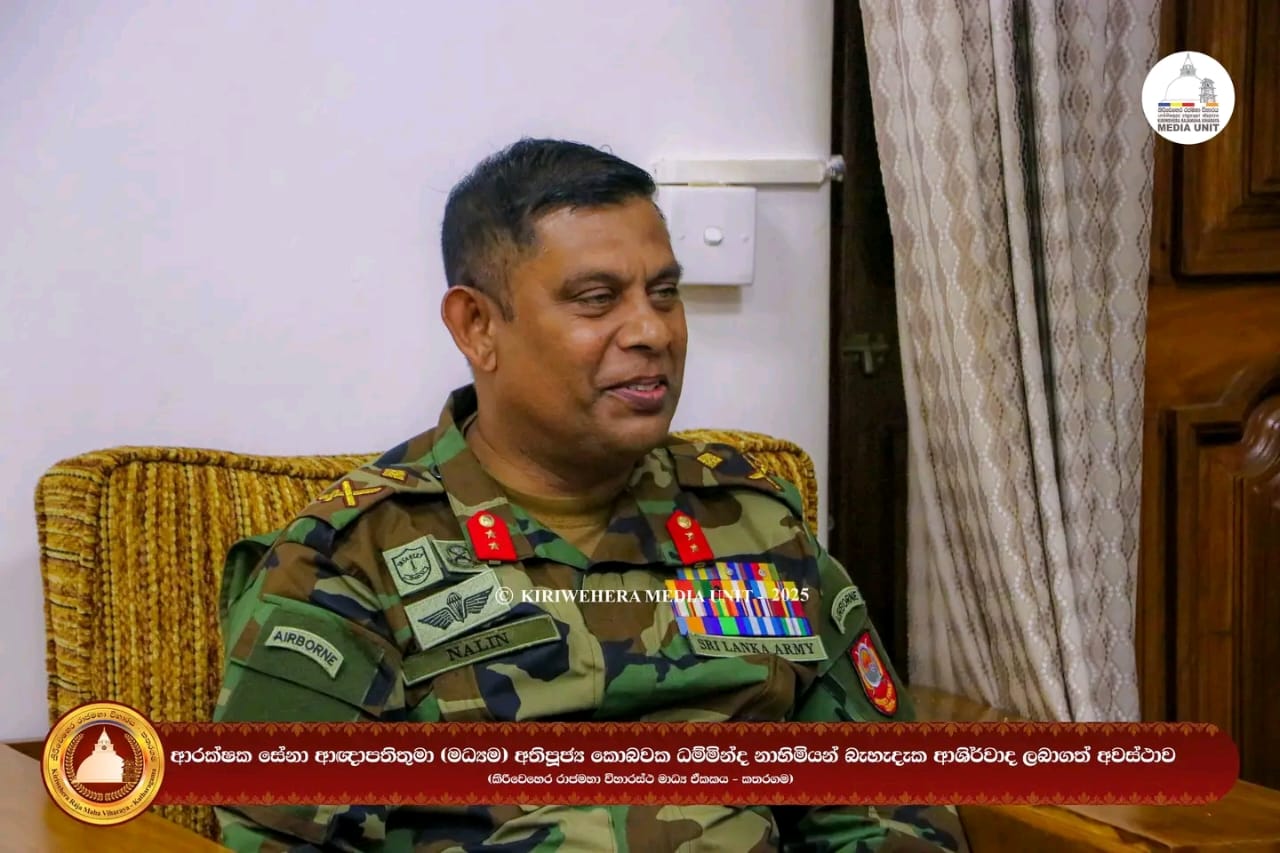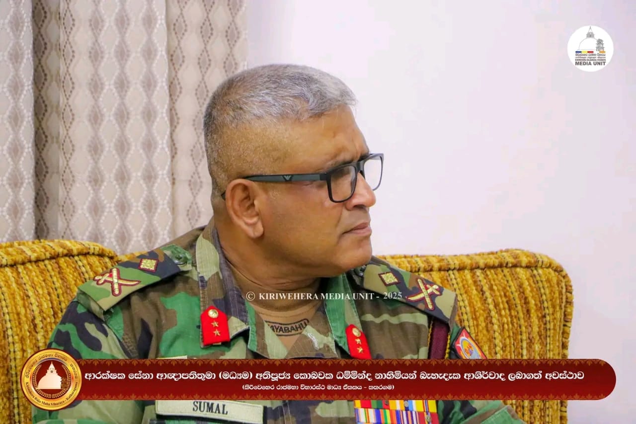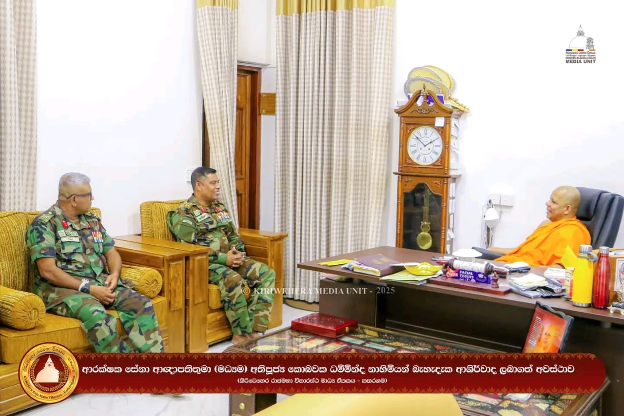 The Commander of the Security Forces (Central) paid a courtesy call on the Chief Sanghanayake of the Ruhunu Magampattuwa, Most Venerable Kobawaka Dhamminda Thero, and after receiving blessings from the Incumbent of the historic Kataragama Kirivehera Rajamaha Viharaya.